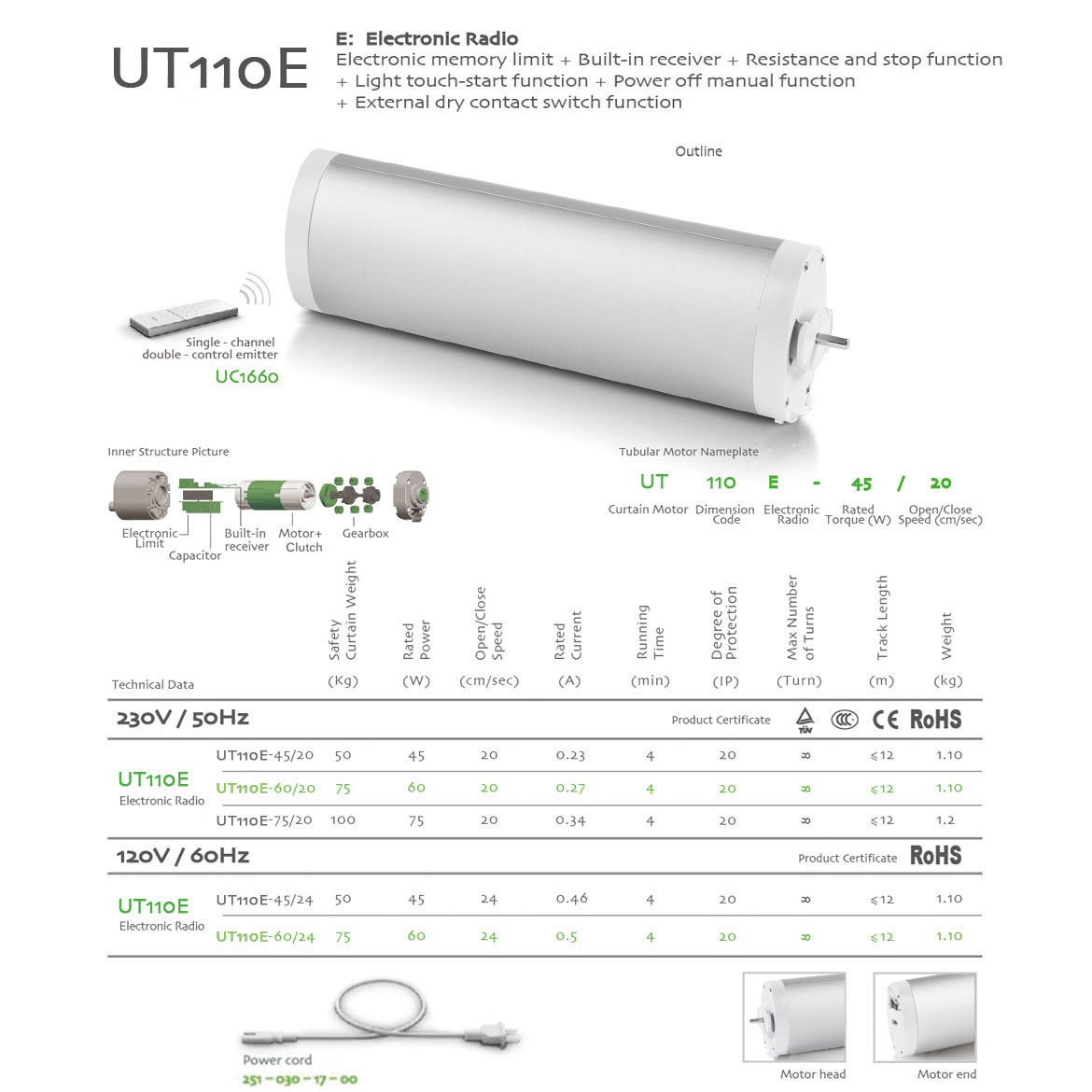 Memorized Limit+Integrated Radio Control+Obstruction Detection+Light touch-start+Manual Override+The third limit position+Compatible with dry contact switch function.