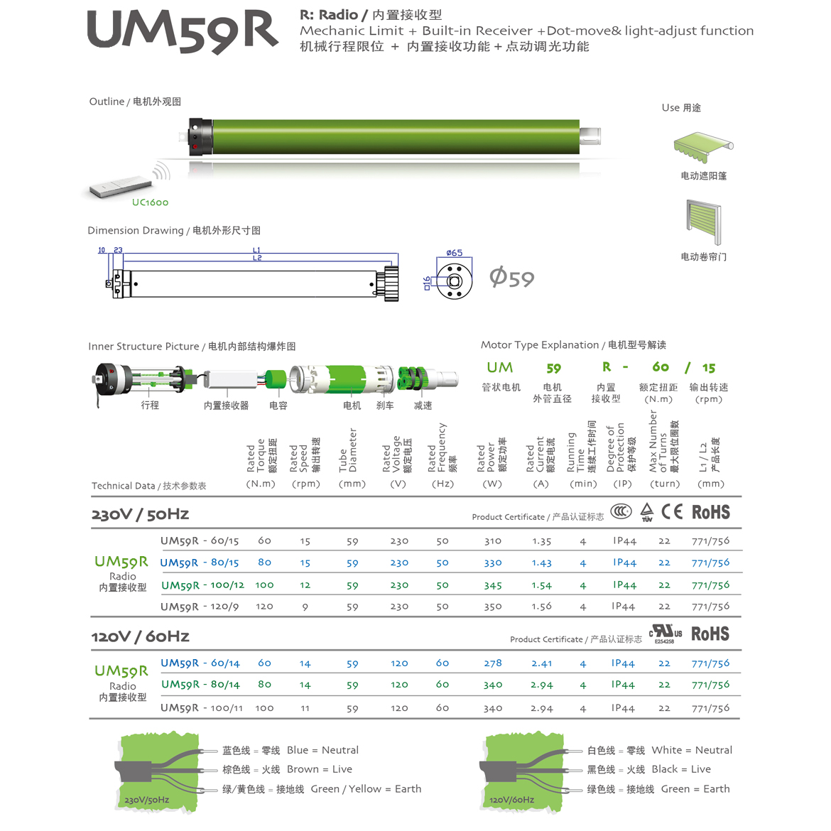 R:Radio/內置接收型 機械行程限位+內置接收器+點動調光功能